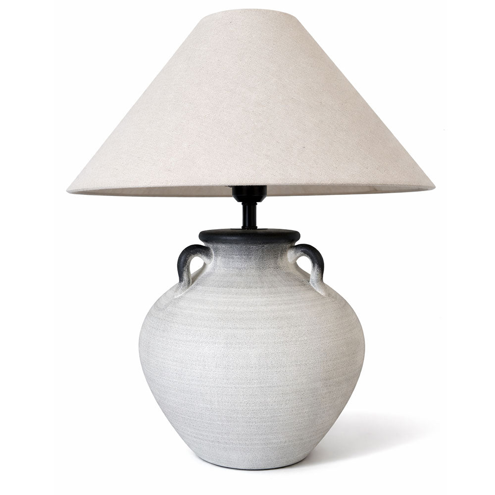 This ceramic table lamp brings a soft, organic aesthetic to modern interiors. Featuring a rounded stone-toned ceramic base with subtle gradient detailing and sculptural side handles, it adds natural texture and understated character to bedside tables, living room consoles or styled spaces. The neutral linen shade provides warm, ambient lighting, while the dark accent at the neck enhances its contemporary contrast. A versatile ceramic bedside lamp designed to complement modern, coastal and relaxed interiors with effortless elegance.