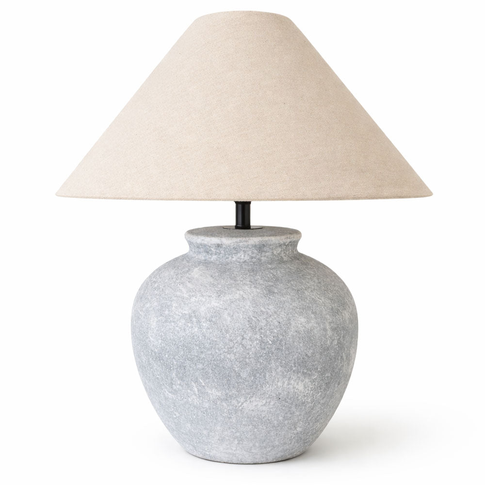 This ceramic table lamp brings cool-toned elegance and natural texture to modern interiors. Featuring a rounded grey ceramic base with a softly mottled finish, it introduces subtle depth and organic character to bedside tables, living room consoles or styled spaces. The gently curved silhouette enhances its sculptural appeal, while the neutral linen shade provides warm, ambient lighting for a balanced contrast. A versatile ceramic table lamp designed to complement contemporary, minimalist and coastal-inspired interiors with effortless sophistication.